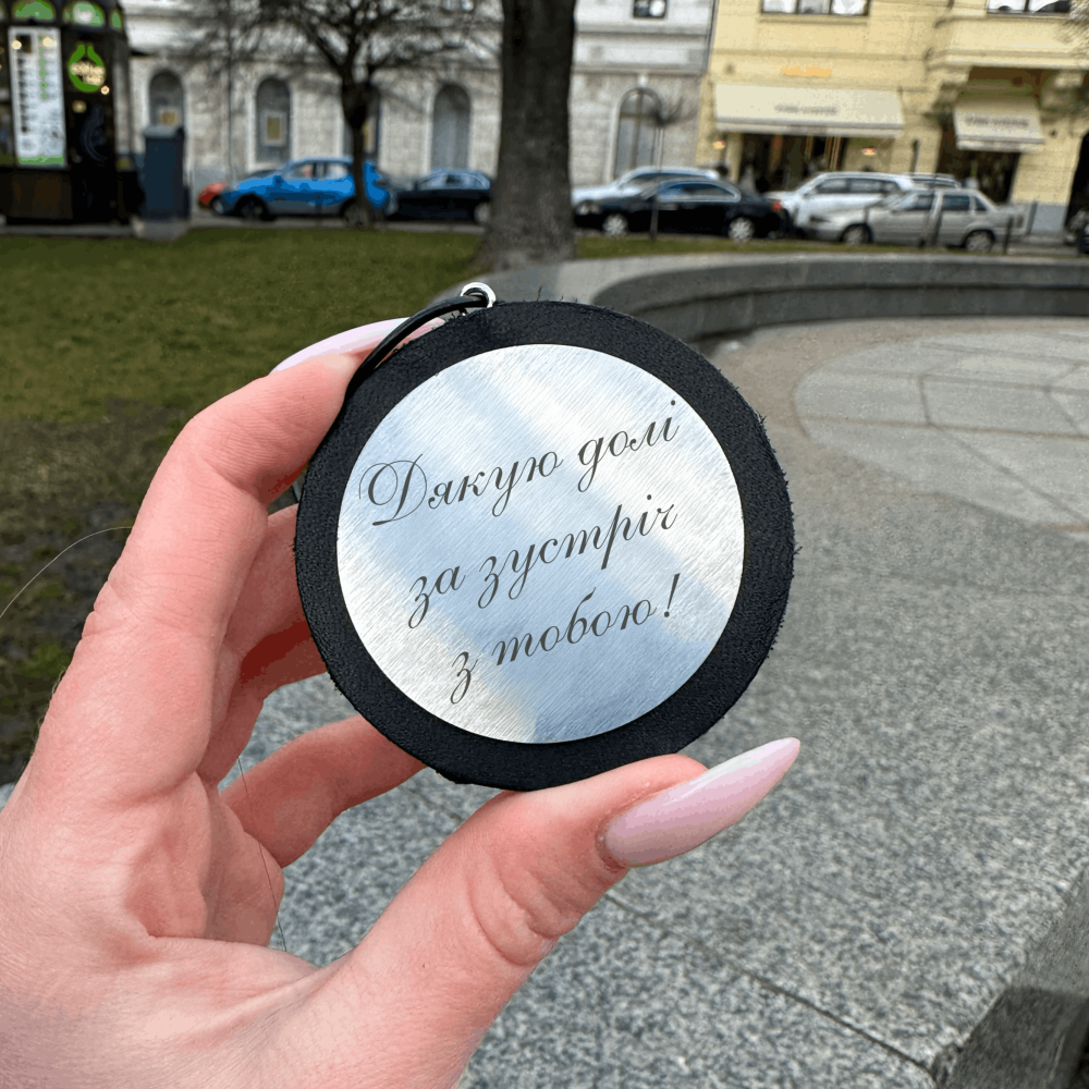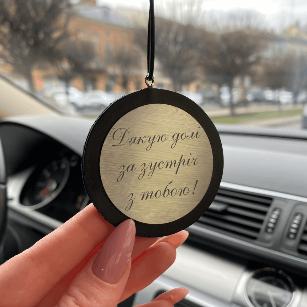 Автомобільна підвіска з гравіюванням гармонійно виглядає на зеркалі заднього виду та додає салону особливої ​​душевності. Це подарунок, який не лежить на поліці — він супроводжує у справах, поїздках, відрядженнях і щодня дарує відчуття близькості навіть на відстані.