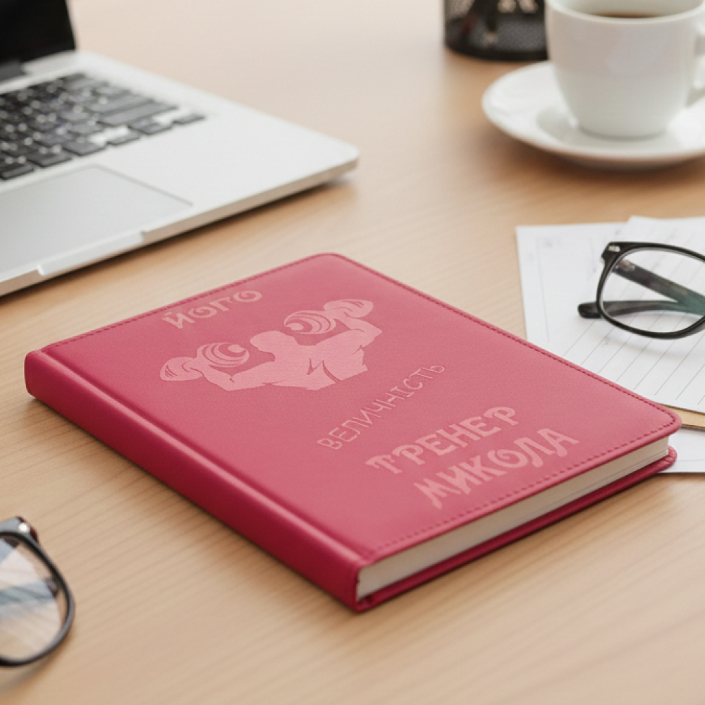 Персоналізація: ми можемо зробити будь-який напис на обкладинці — ім’я тренера, назву залу/команди, мотиваційну фразу, дату або логотип. Так блокнот стане не просто корисним, а по-справжньому особистим і “професійним”.