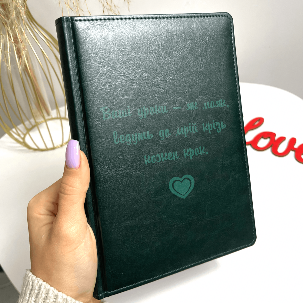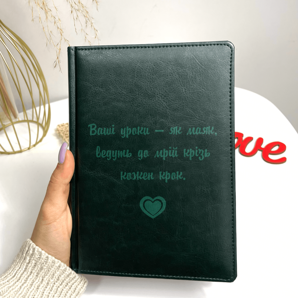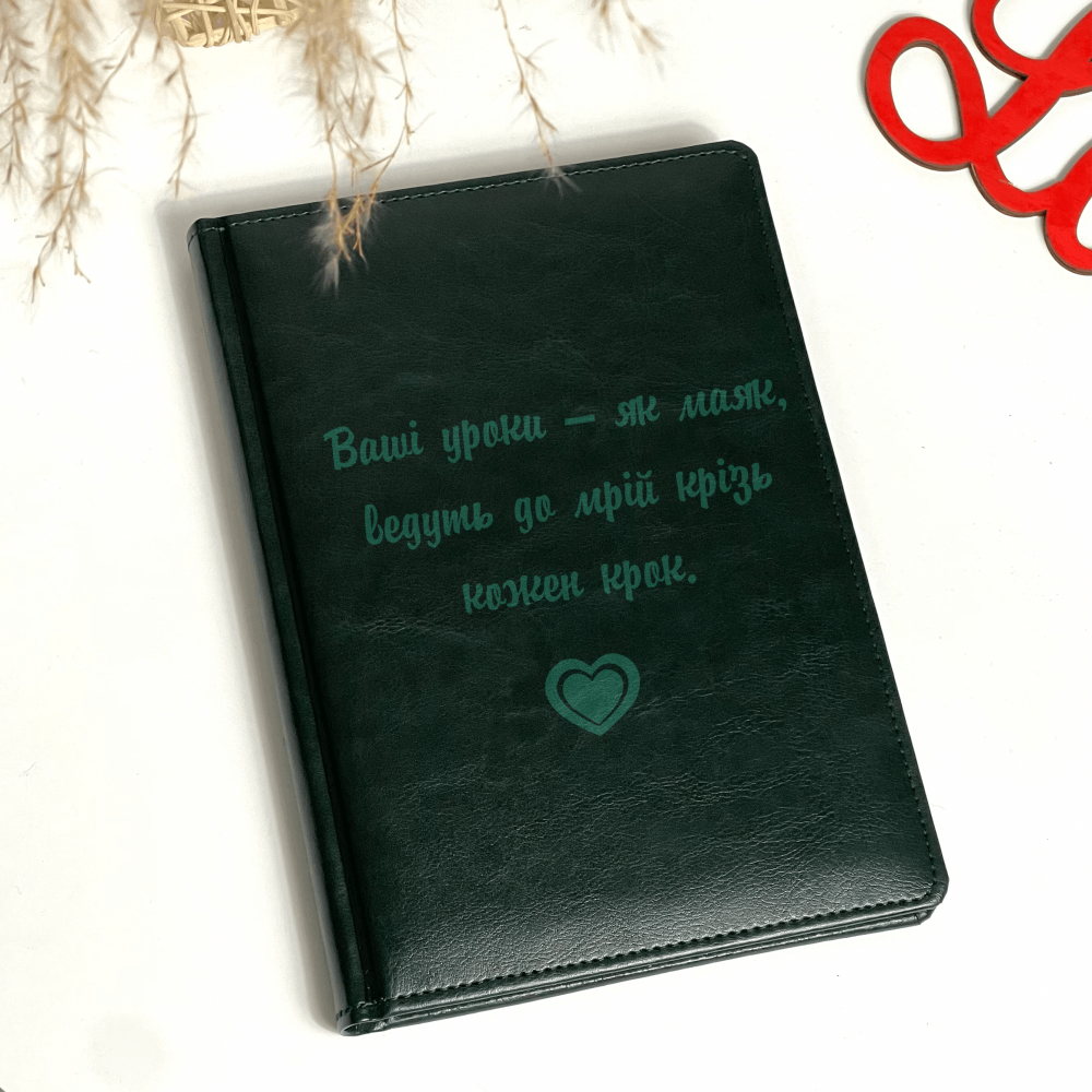 Блокнот Смарагдовий з гравіюванням з теплими словами, подарунок для вчителя/вчительки