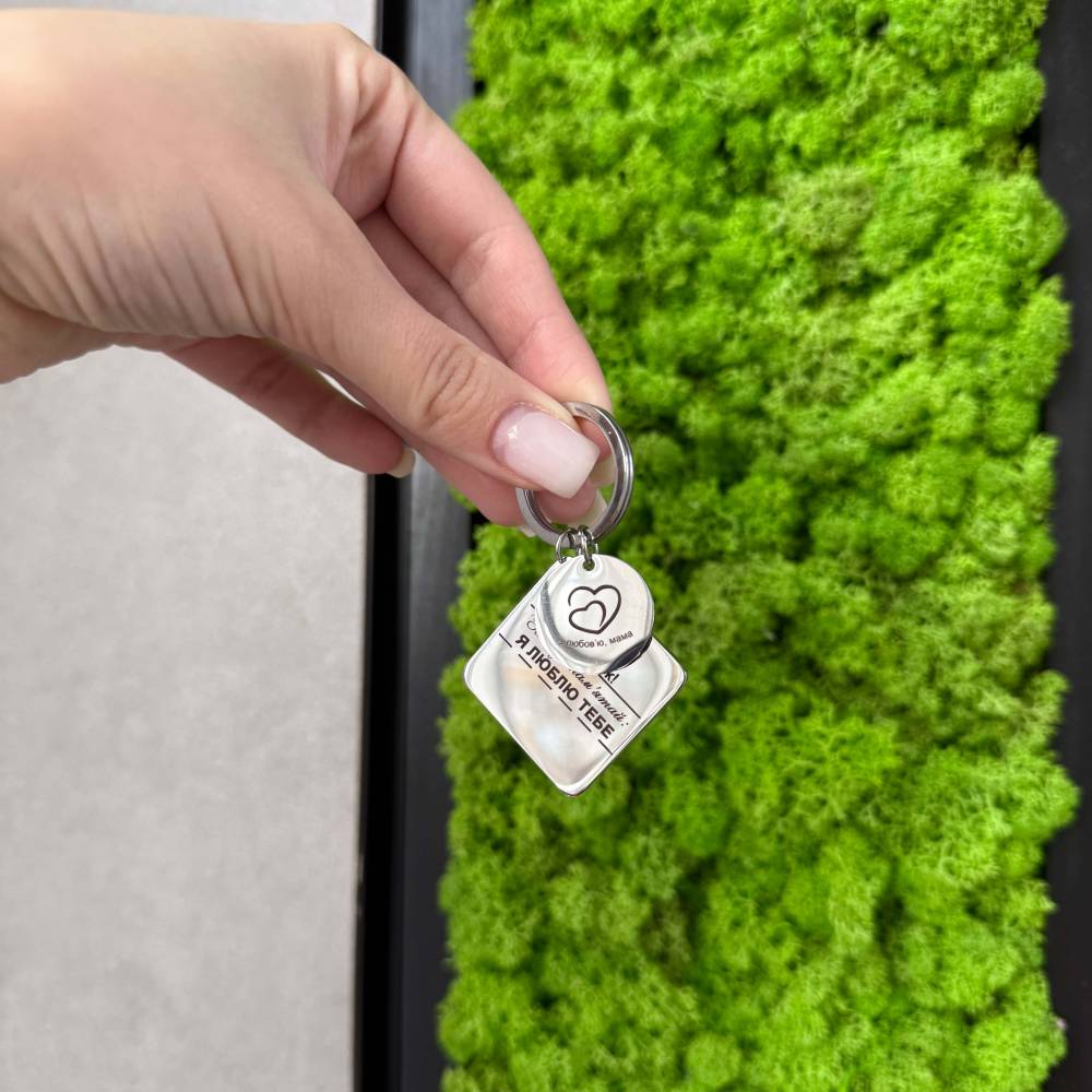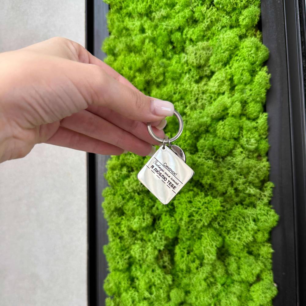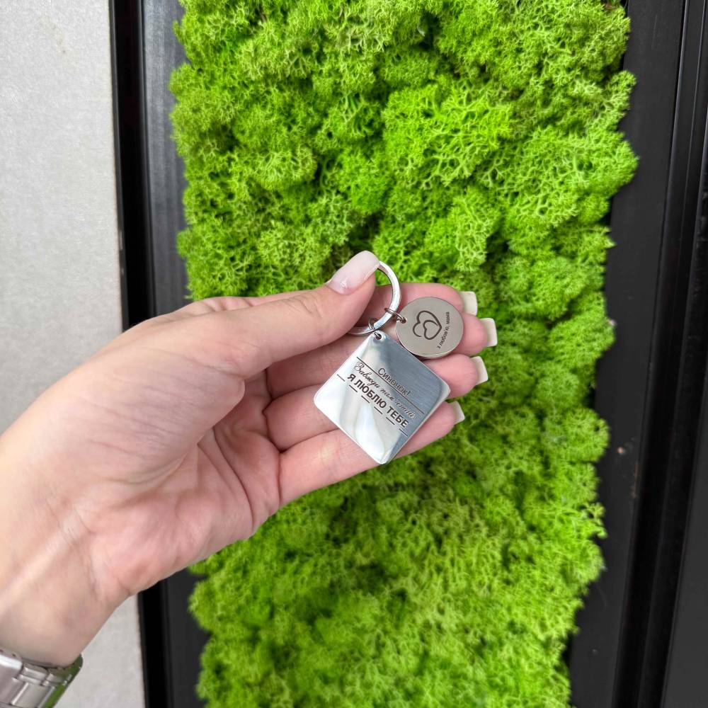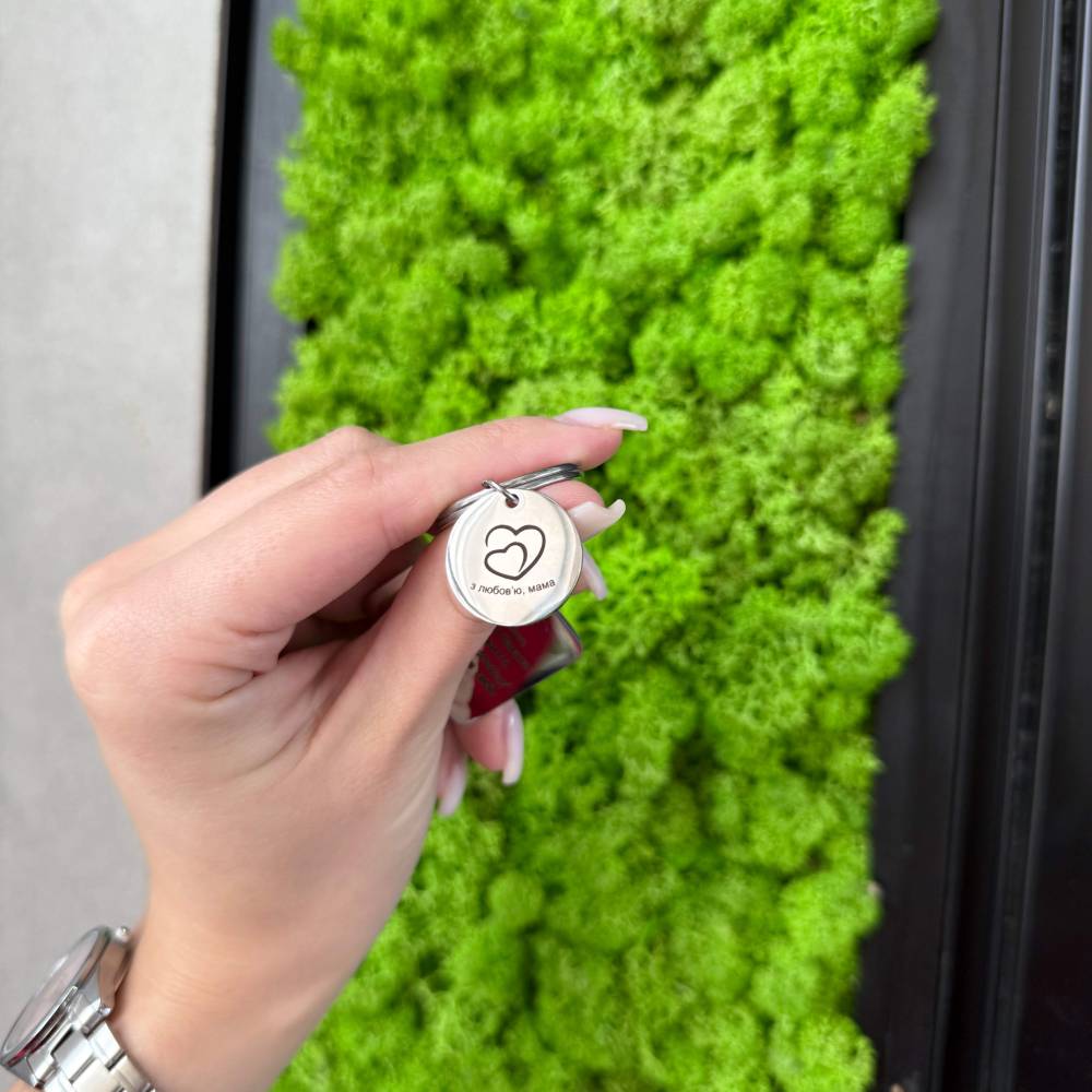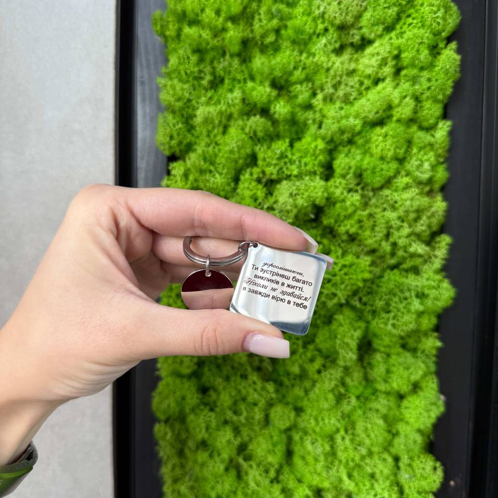 Наш брелок виготовлений із високоякісної сталі, що забезпечує міцність та довготривалість - так само, як ваша підтримка, яка завжди поруч. Завдяки лазерному гравіюванню ми можемо нанести будь-який текст: