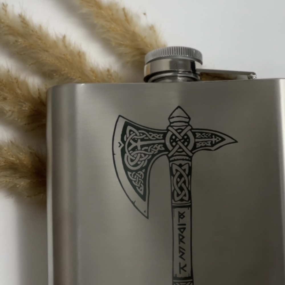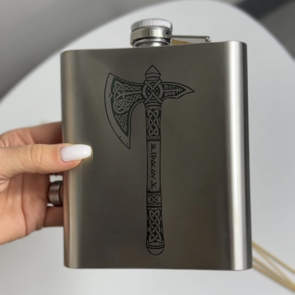 Фляга изготовлена из нержавеющей стали, имеет надёжный корпус и аккуратную лазерную гравировку с топором и рунами — чёткую, стойкую и долговечную. Благодаря компактному объёму её легко взять с собой в дорогу, на природу или в поход.