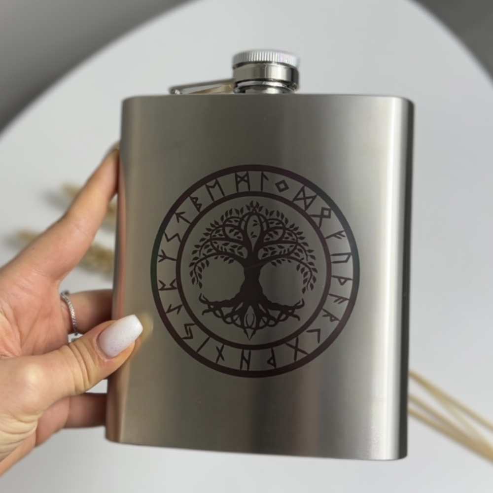 Фляга изготовлена из нержавеющей стали, имеет надёжный корпус и аккуратную лазерную гравировку с топором и рунами — чёткую, стойкую и долговечную. Благодаря компактному объёму её легко взять с собой в дорогу, на природу или в поход.