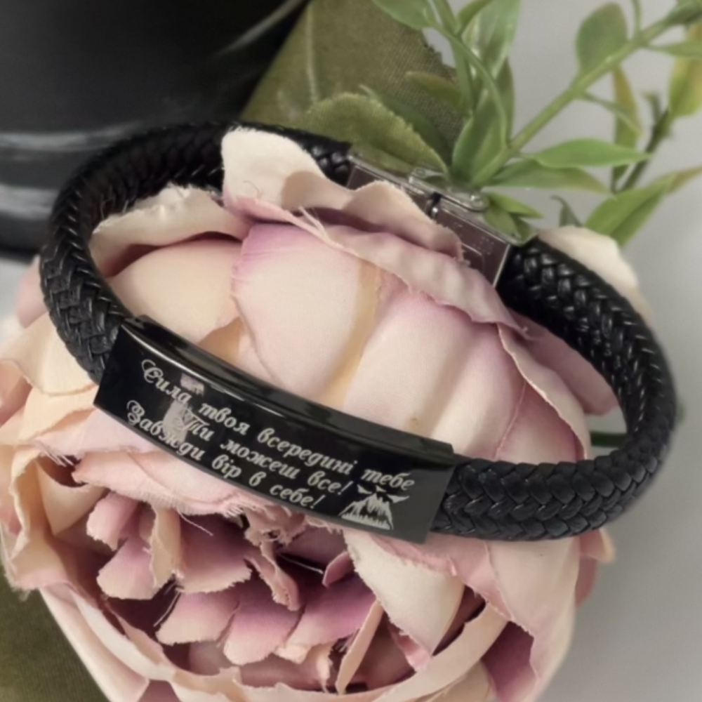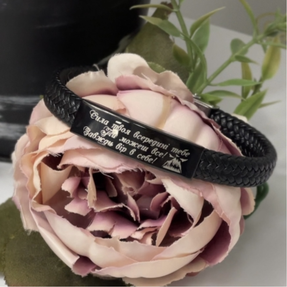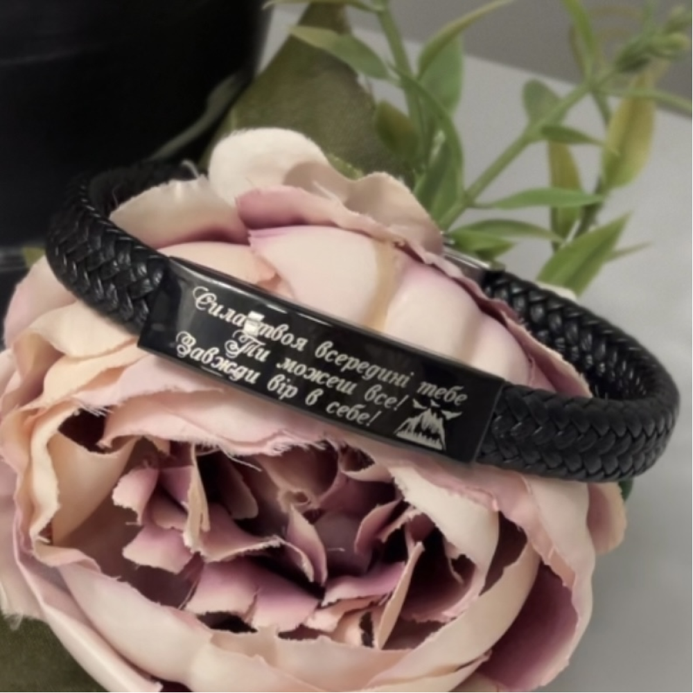 Унікальний браслет із екошкіри з особистим гравіюванням - особливий подарунок для вас або для близької вам людини! Цей елегантний браслет є виразом стилю та класики, який може бути перетворений на ще більше особистий та неповторний подарунок завдяки можливості гравіювання. Ви маєте можливість додати унікальний акцент, який зробить цей аксесуар по-справжньому особистим. Подаруйте цей елегантний браслет з персоналізованим гравіюванням - символ стилю та оригінальності, який завжди нагадуватиме про важливість та унікальність отримувача. Переваги: Лазерна технологія гравіювання забезпечує унікальний дизайн, стійкість до подряпин та іржі; Стильний та класичний вигляд, що підкреслить особистий стиль.