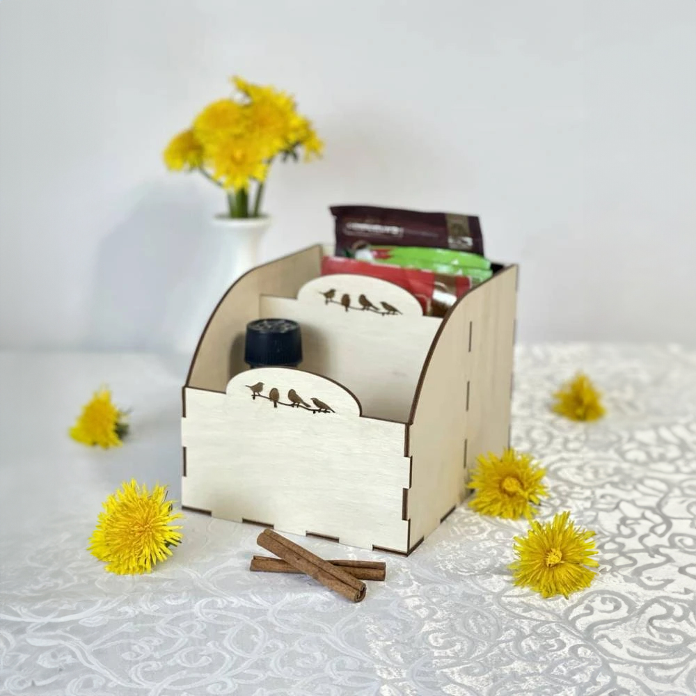 Удобная и стильная коробочка для хранения специй с декоративным вырезом птиц. Изготовлен из качественного материала толщиной 4 мм.