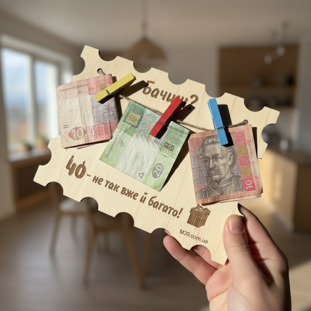 В комплект входить сама листівка з дерева, прищіпки та шнурочок