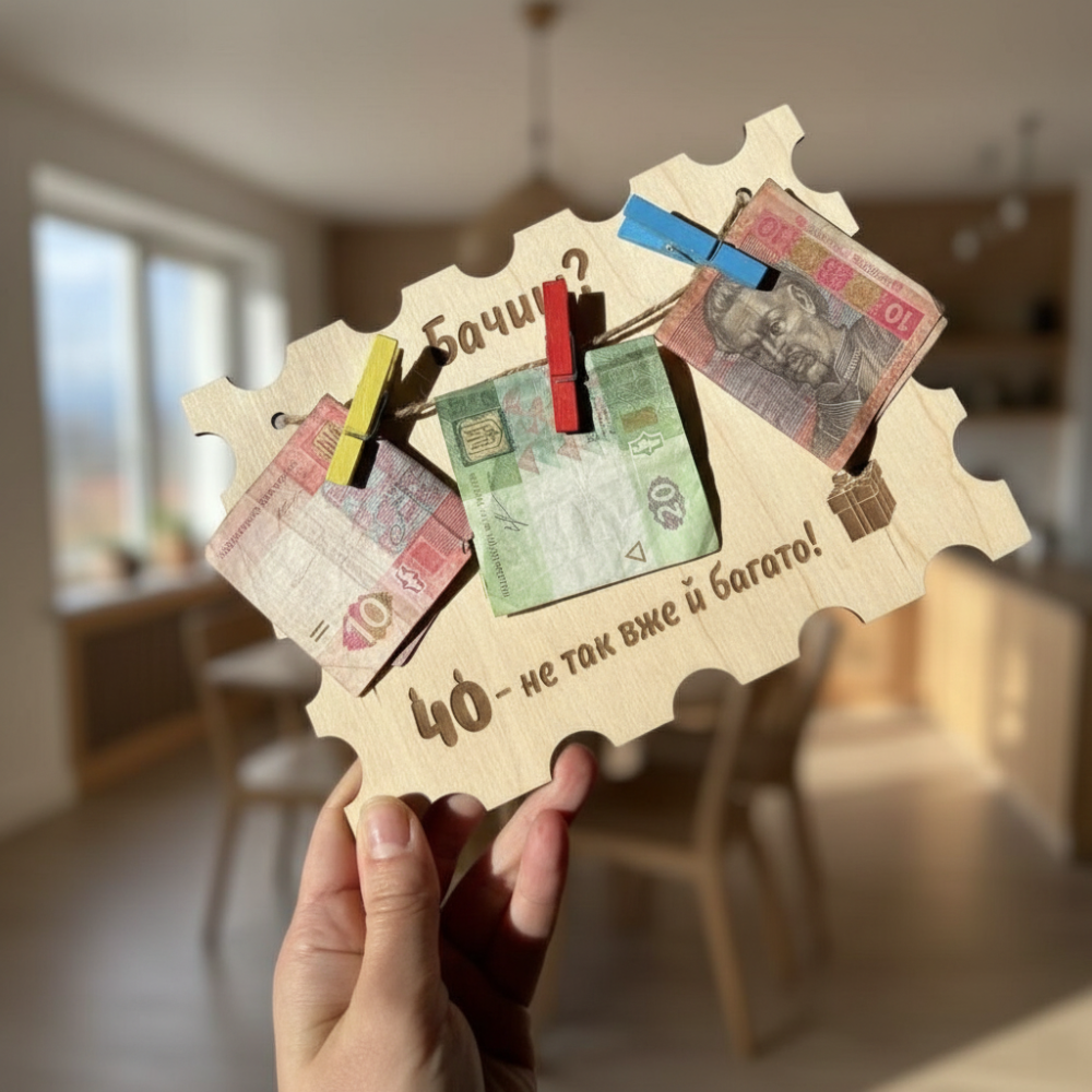 В комплект входить сама листівка з дерева, прищіпки та шнурочок