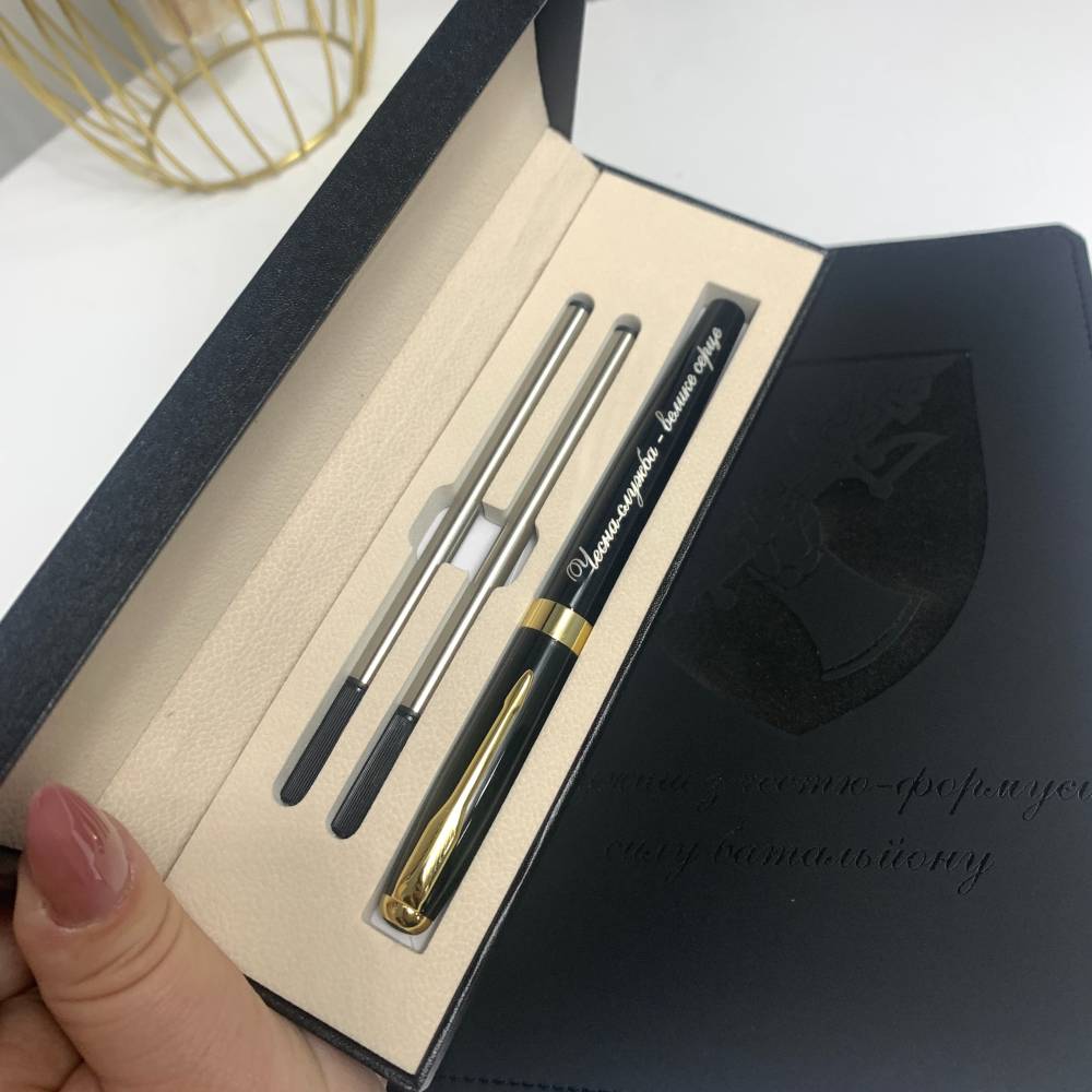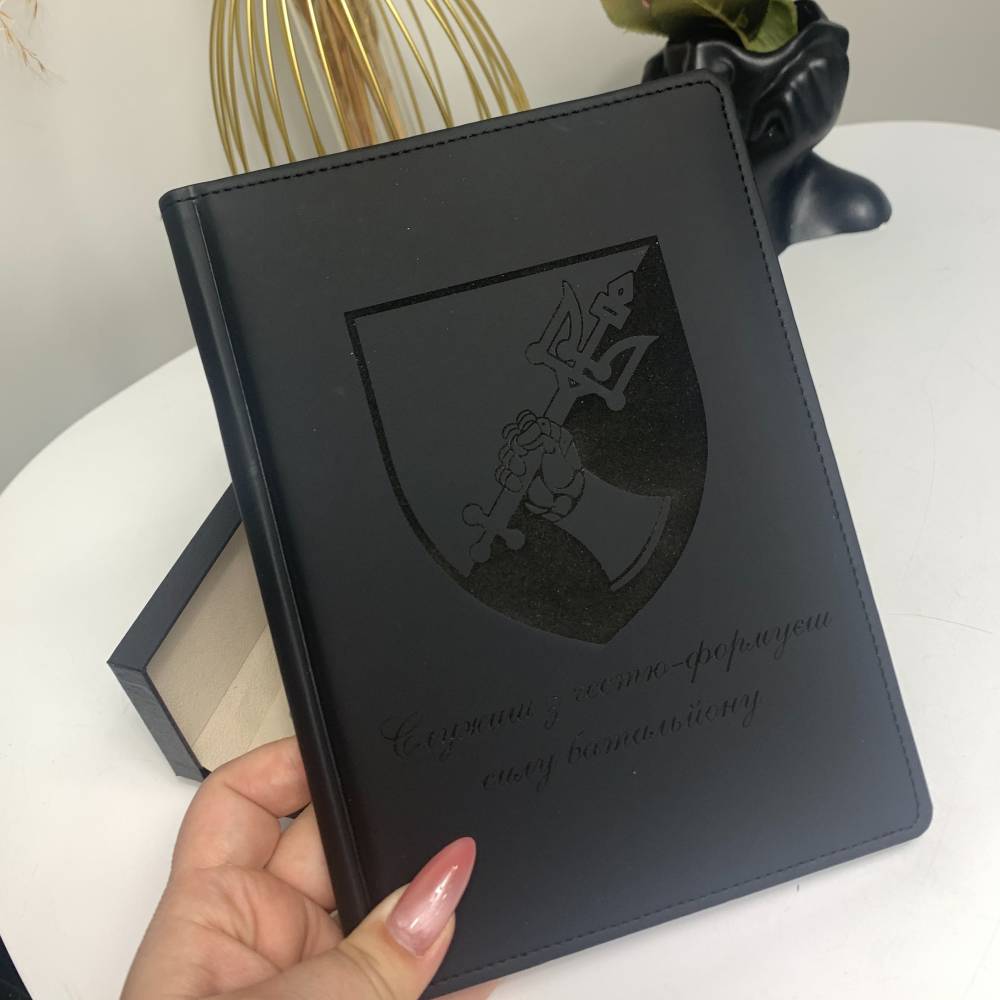 Стильный блокнот и ручка с мотивационной гравировкой станут практичным и эмоциональным подарком для военного — на службе, в пути, на позиции или во время отдыха.