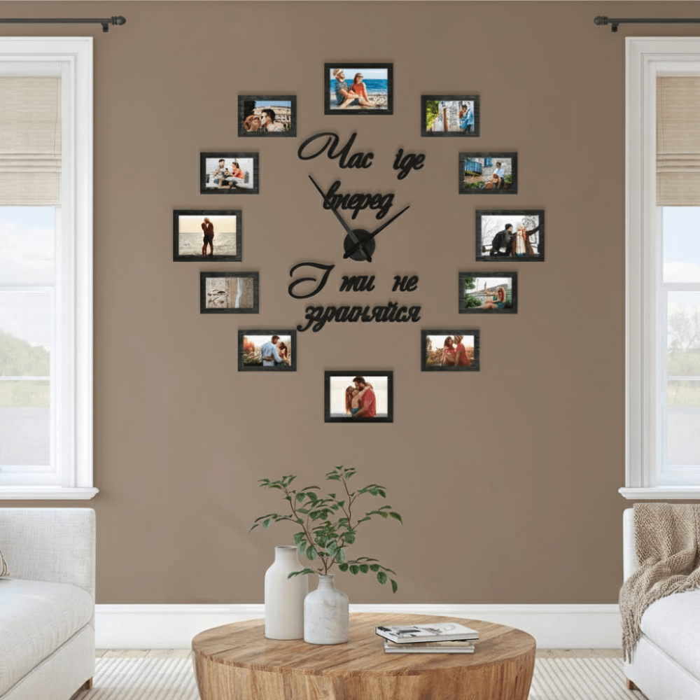 Шукаєте оригінальний варіант декоративного оздоблення інтер'єру вашої кімнати? тоді маємо для вас чудову пропозицію - це Настінний годинник з фоторамками "Час іде вперед". Це не просто виріб з дерева, - це справжній витвір мистецтва, який принесе у ваш дім затишок, теплу, приємну атмосферу, підкреслить ваш стиль та допоможе зберегти найцінніші моменти з рідними на видному місці!