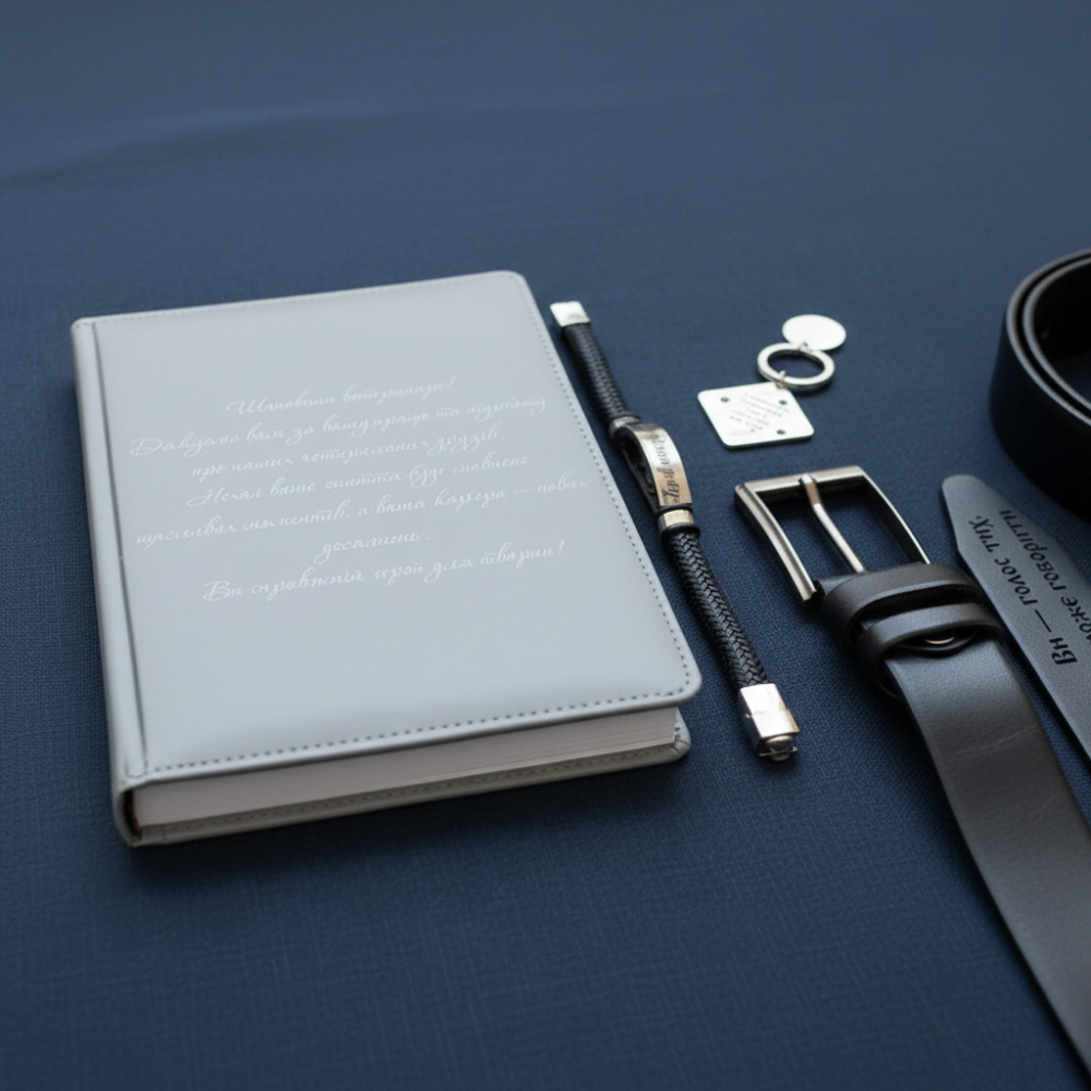 Шукаєте унікальний варіант подарунку для ветиринара? Тоді маємо чудову пропозицію для вас - це Набір Аксесуарів з Іменним Гравіюванням. Цей комплект - не просто практичні речі, це справжні витвори мистецтва з використанням технології лазерного гравіювання, які подарують щирі, непідробні емоції та додадуть ексклюзивності та стилю до будь-якого образу, адже ви зможете награвіювати на цих виробах будь-який текст або зображення!