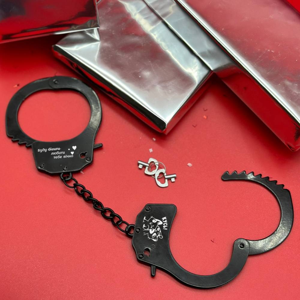 черные наручники с персональной гравировкой станут изысканным символом вашей страсти, нежности и взаимного доверия.