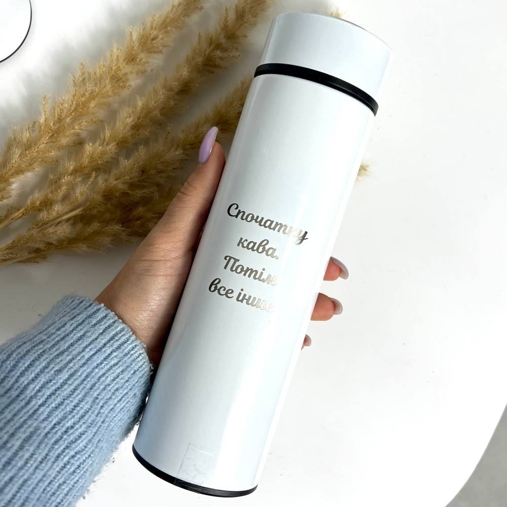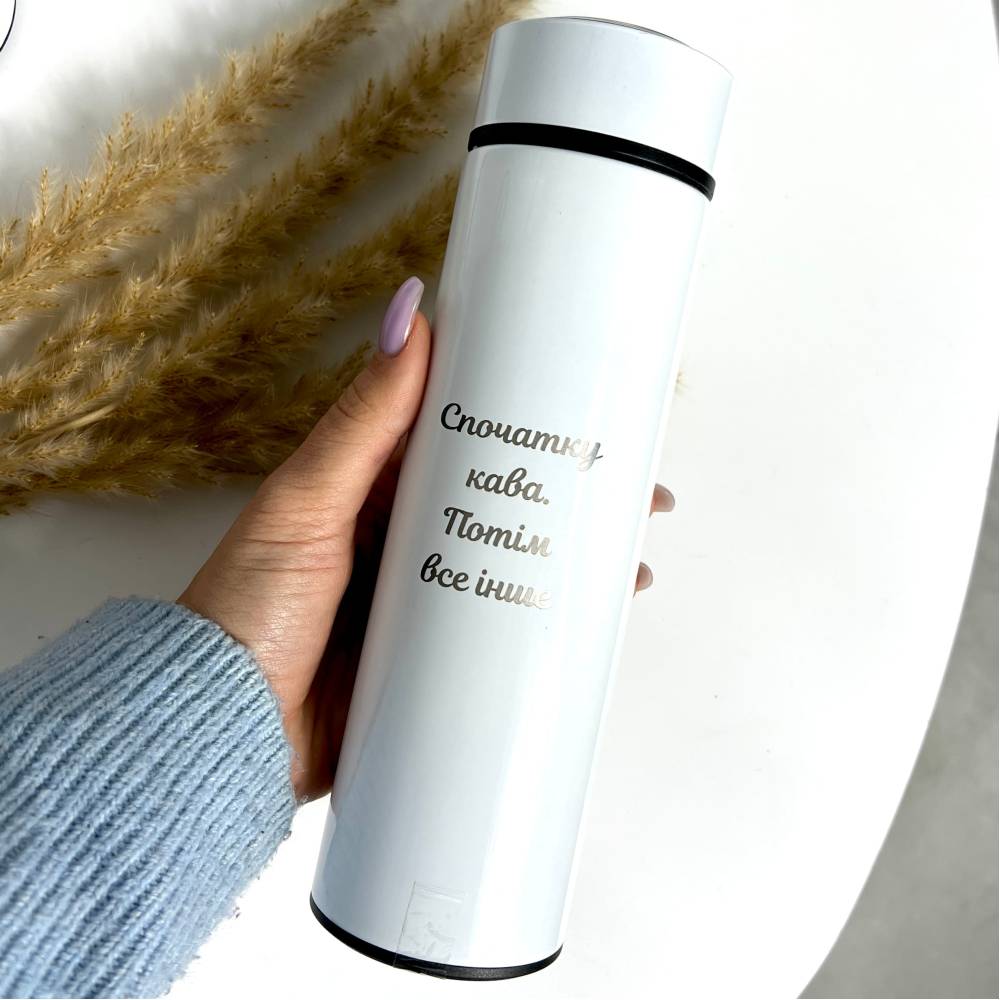 Ми можемо зробити будь-який напис: змінити фразу, додати ім’я, дату, короткий меседж або ваш внутрішній жарт — щоб термос був максимально персональним.
