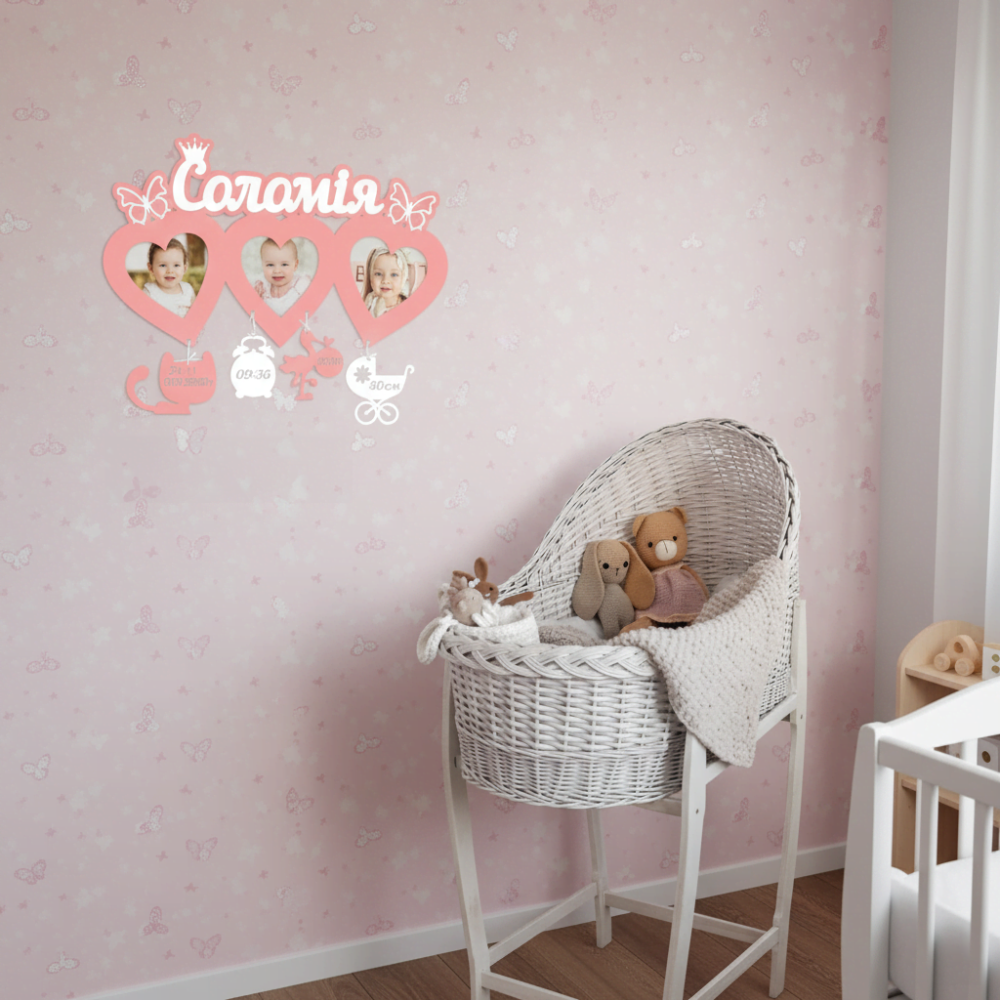 Шукаєте ніжний та естетичний варіант подарунку для матусі, яка щойно народила? Тоді ми маємо для вас чудовий варіант - це Дитяча іменна метрика на 3 фото в формі сердечок. Цей витончений виріб з дерева гарантовано подарує щирі, непідробні емоції, додасть затишку і тепла до інтер'єру оселі, а також допоможе зберегти найцінніші спогади про малятко на видному місці!