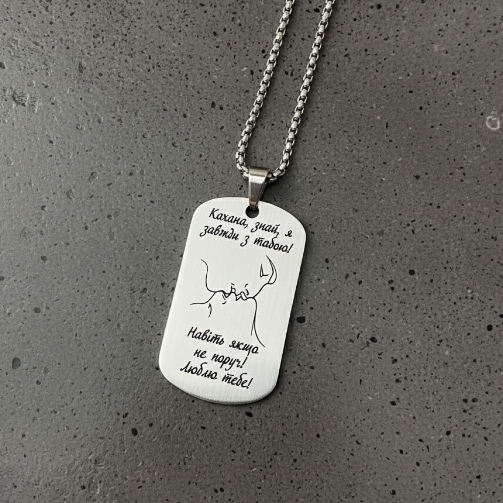 Каждый жетон изготовлен из высокого качества стали 304, что обеспечивает безупречную гравировку ваших любимых сообщений и фотографий на черной гладкой поверхности. А благодаря современному процессу гравировки мы сможем передать каждую мельчайшую деталь вашего видения с кристальной четкостью.