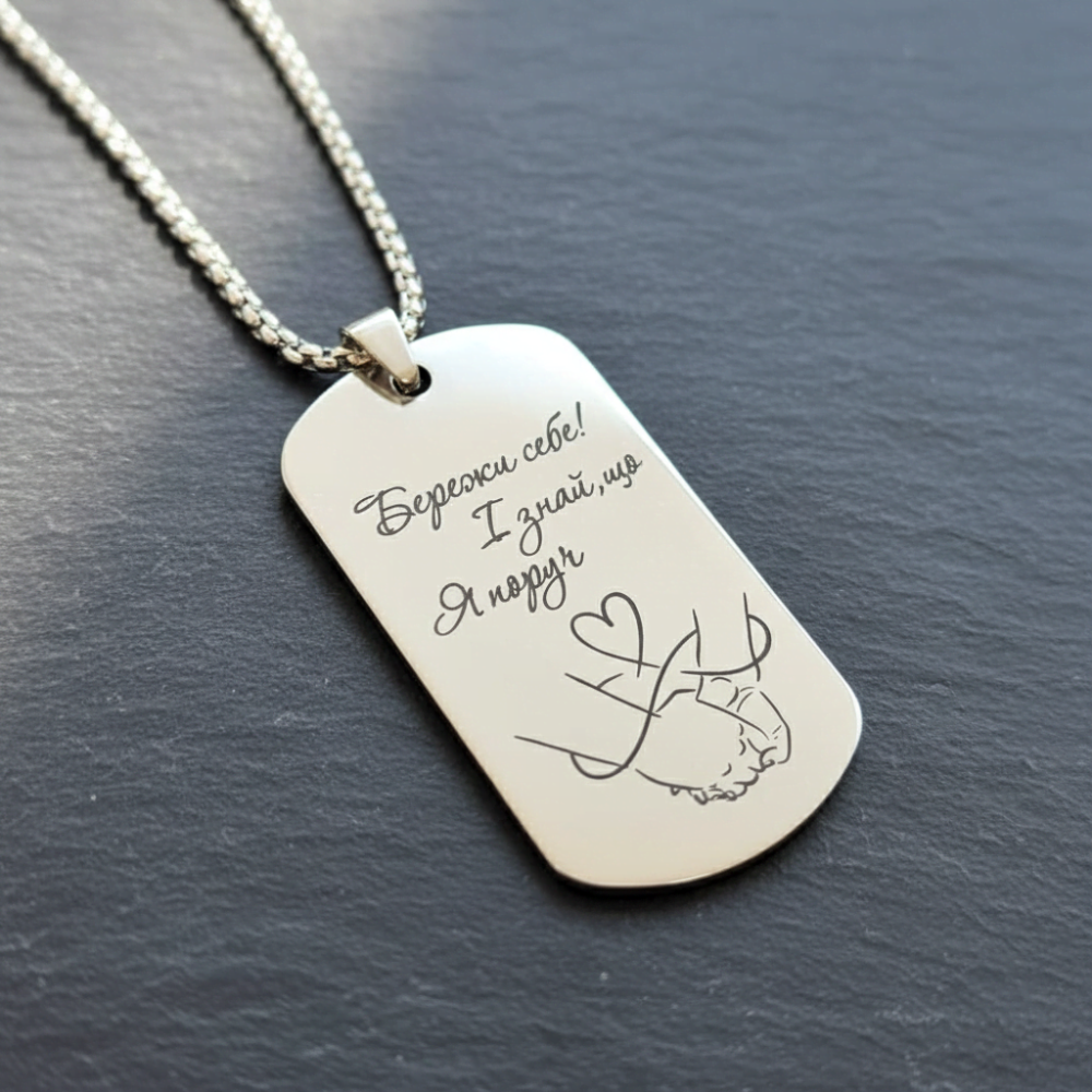 Каждый жетон изготовлен из высокого качества стали 304, что обеспечивает безупречную гравировку ваших любимых сообщений и фотографий на черной гладкой поверхности. А благодаря современному процессу гравировки мы сможем передать каждую мельчайшую деталь вашего видения с кристальной четкостью.