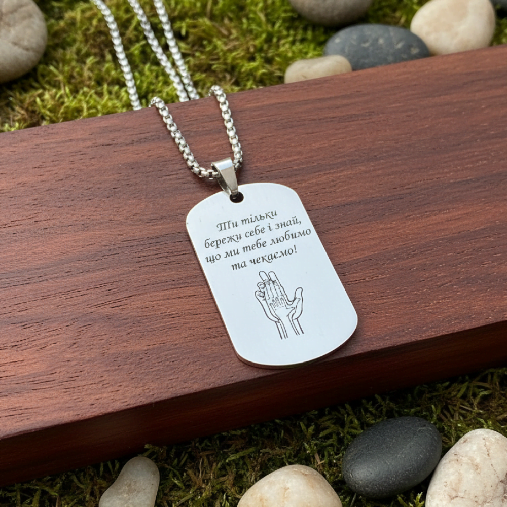 Кожен жетон виготовлений з найвищої якості сталі 304, що забезпечує бездоганне гравірування ваших найулюбленіших повідомлень та фотографій на чорній гладкій поверхні. А завдяки сучасному процесу гравіювання ми зможемо передати кожну найдрібнішу деталь вашого бачення з кристальною чіткістю.